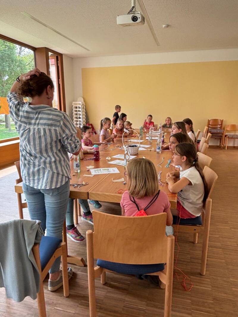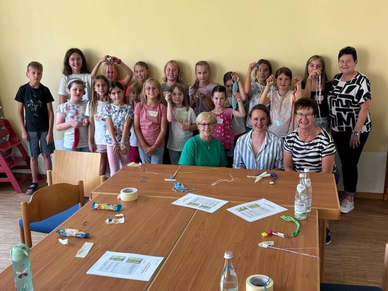 Unter Anleitung von Susanne Kochherr und ihrem Helferteam knüpften 17 Kinder Armbänder, Schlüsselbänder und Dekoelemente in der Arbeitstechnik Makramee. Innerhalb von zwei arbeitsintensiven, entspannten Stunden schafften einige Kinder sogar mehrere Werkstücke. Wer wollte, durfte sich auch Material mit nach Hause nehmen.