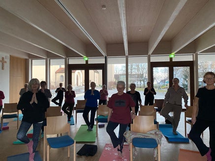 Jeden Mittwoch bietet die aus- und ständig fortgebildete Yogalehrerin Tanja Kiener Yoga auf dem Stuhl an. Es gibt mittlerweile schon zwei Gruppen á 20 Frauen, die an diesem Kurs im Pfarrheim teilnehmen.